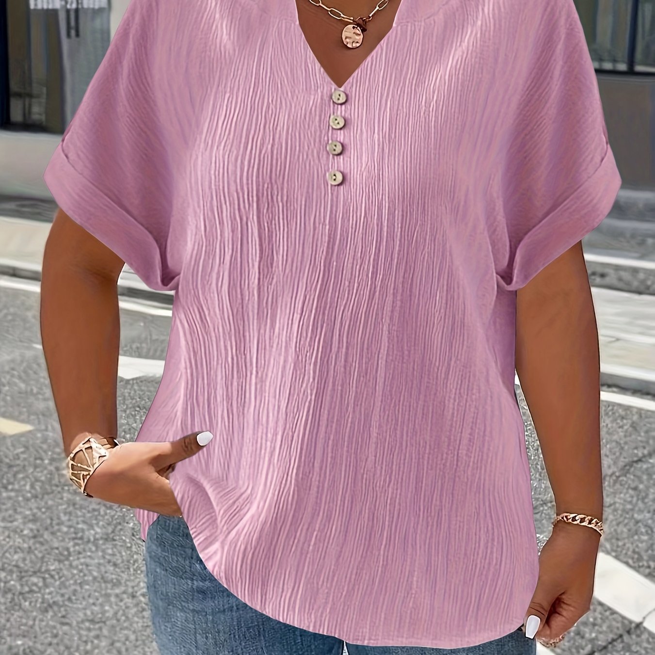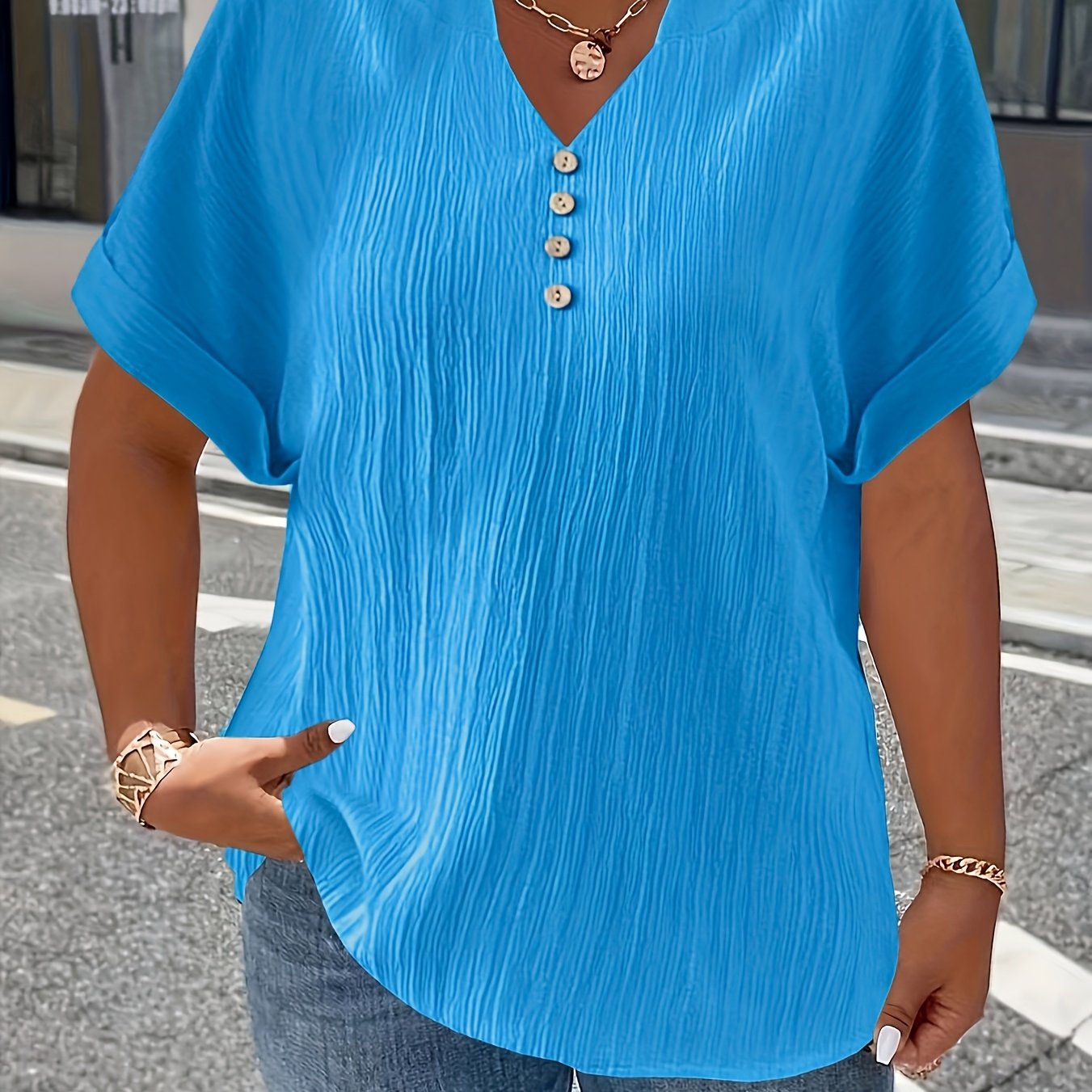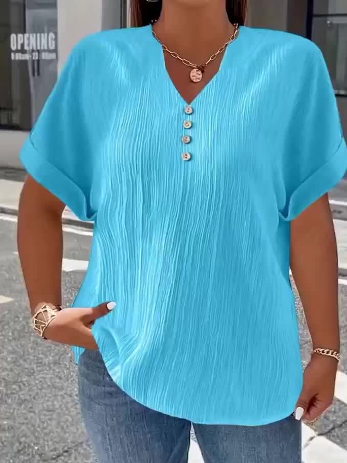 The Noelle | Textured V-Neck Button Top is your easy, everyday upgrade, lightweight, flattering, and effortlessly put-together. Designed with a relaxed fit, a soft textured finish, and a V-neckline with button detail, it gives you that “styled without trying” look in seconds.